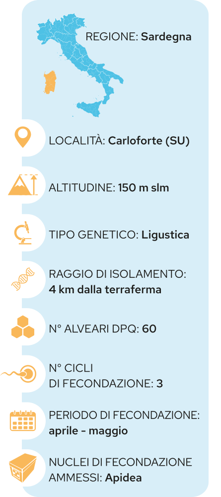 Attualmente l’ADA può contare su 60 alveari con regine DPQ omogeneamente distribuiti su tutta l’isola e di un sito in cui è possibile collocare agevolmente diverse centinaia di Apidea in posizione ombreggiata. Le peculiari condizioni climatiche del sito rendono possibile l’allevamento precoce dei maschi già dalla fine dell’inverno, ma è nel periodo primaverile che si presentano le migliori condizioni per ottenere ottime fecondazioni, favorite da ampi periodi anticiclonici asciutti con temperature massime stabilmente al di sopra dei 20°C.